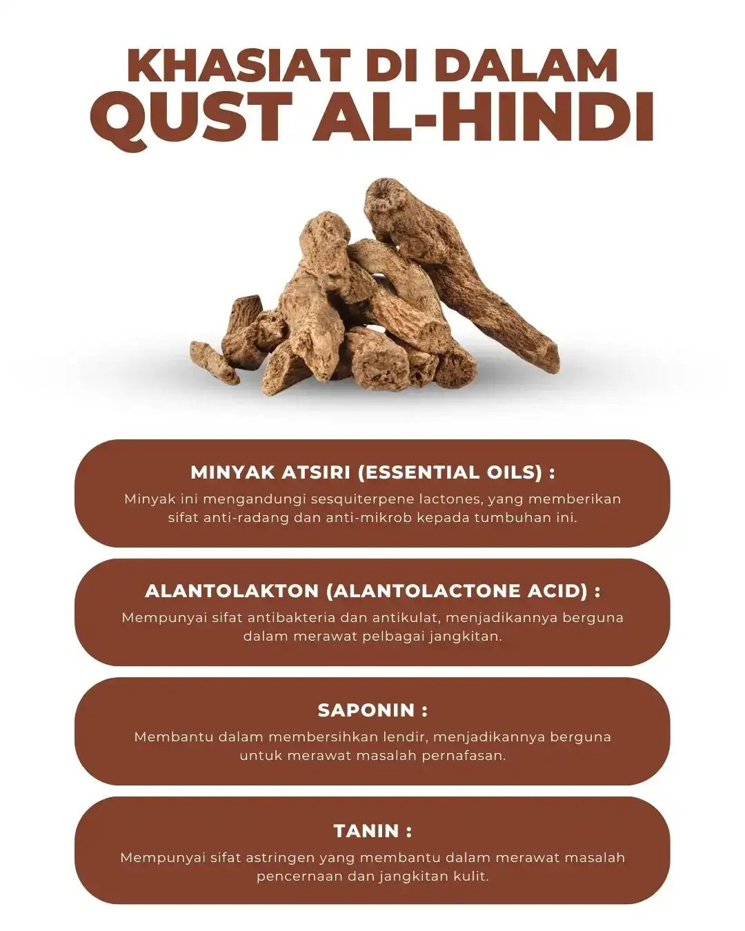 Qust Al-Hindi telah lama digunakan sejak zaman dahulu lagi dan terbukti amat berkhasiat untuk mengatasi masalah berkaitan sistem pernafasan terutamanya masalah Asma, Lelah, Sesak Nafas dan Resdung